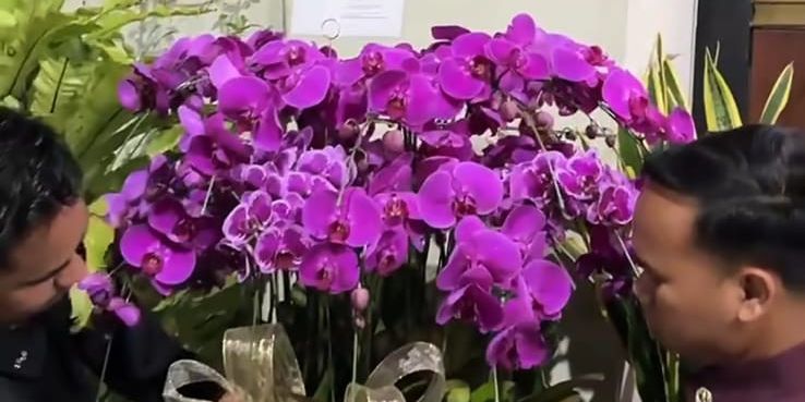 Anggrek cantik itu ditempatkan dalam pot hijau tua berhias pita emas, lengkap dengan ucapan selamat dari Prabowo. Selain dari Prabowo, anggrek putih juga dikirimkan oleh Sekretaris Kabinet Teddy.